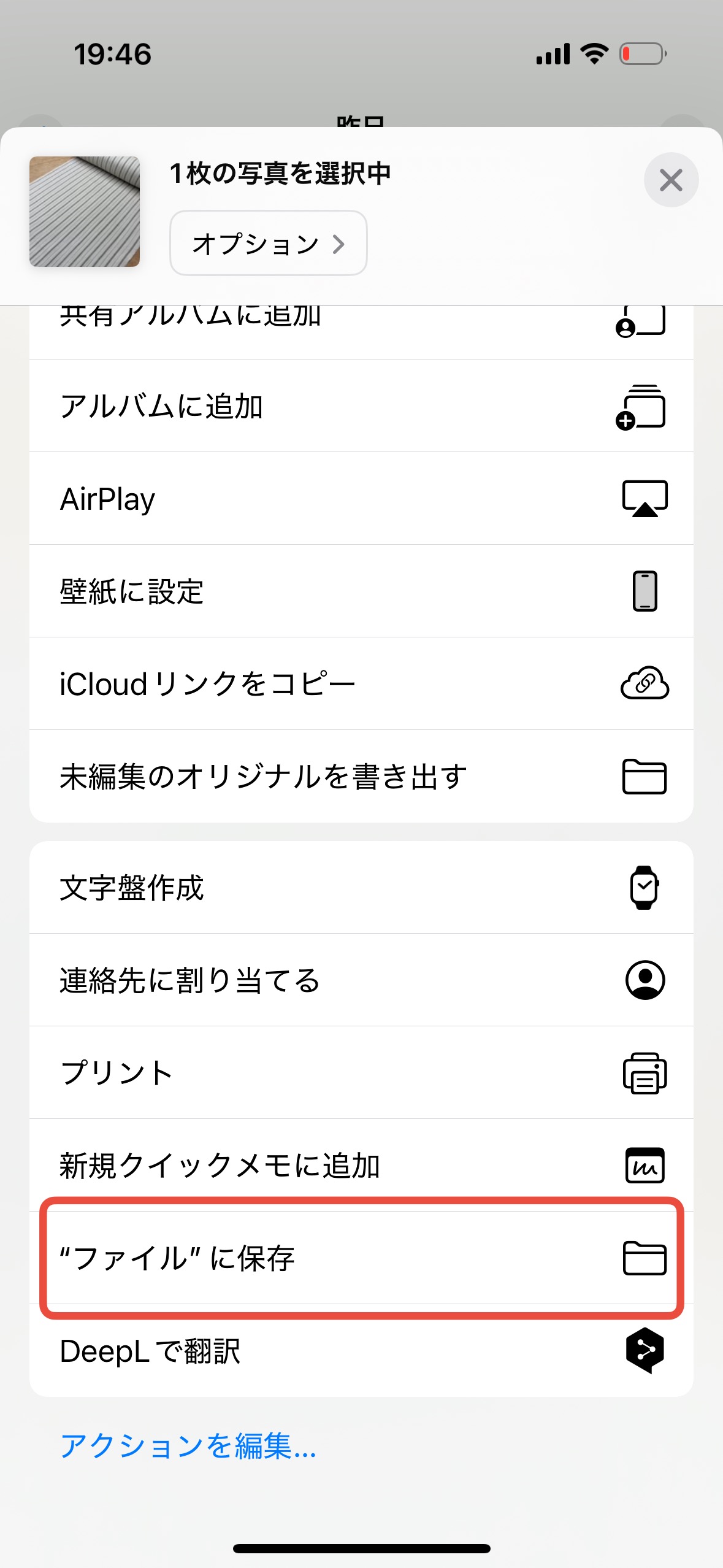 やじるしファイルに写真が保存されているので、タップして開き、ファイル名をタップ、「書き出し」をタップします。